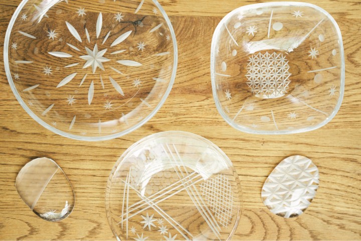 ダイヤモンドが練りこまれた金属のホイールを回転させて硝子を削り、自由に文様を描くワークショップです。