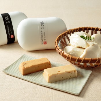 国産大豆と沖縄産の海水にがりを用いて二度仕込みの独自製法で作った寄せ豆腐は、余計なものを使わない自然な甘みが特長です。豆腐職人と何度も試作を繰り返し出来上がったオリジナルレシピの手作り寄せ豆腐を、漬物専門店こだわりの味噌床で2週間じっくりと熟成させました。まろやかな味わいの「贅」と、味噌漬け豆腐の旨味にスモーク薫る濃厚な味わいの「燻」をぜひお楽しみください。