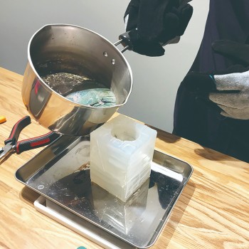 手鍋で金属を溶かしてシリコーン型へ流し込む「鋳造」。