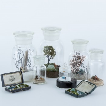 「明け方の夢で見たような気のする光景」を統一テーマに、鉱物標本を理科硝子・アンティークなどに閉じ込めたジオラマ作品。どこかで見たような、ここではない世界をお楽しみください。