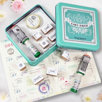 日付印、ゴム印、マスキングテープがセットになった、日々の手帳作りが楽しくなる手帳デコセットです。フレームスタンプで好みのサイズの枠を作り、日付を記入。曜日のマスキングテープを貼れば、シンプルなノートや手帳がオリジナルの手帳に早変わり。「TASK」&「EVENT」&「済」スタンプで日々のスケジュールを管理&記録できます。セットの日付印は手帳にぴったりな可愛いミニサイズ。収納に嬉しい専用缶入りです。