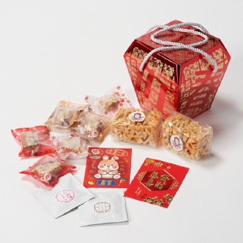 新春にふさわしい華やかなパッケージに、人気の台湾菓子「沙琪瑪(サチマ)」「ヌガークッキー」、「台湾茶」の詰め合わせをご用意しました。