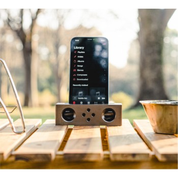 アルミニウムの削り出しで作られたスマートフォン用スピーカー。面倒な