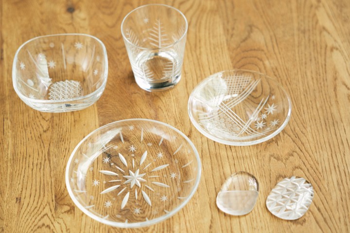 ダイヤモンドが練りこまれた金属のホイールを回転させて硝子を削り、自由に文様を描くワークショップです。