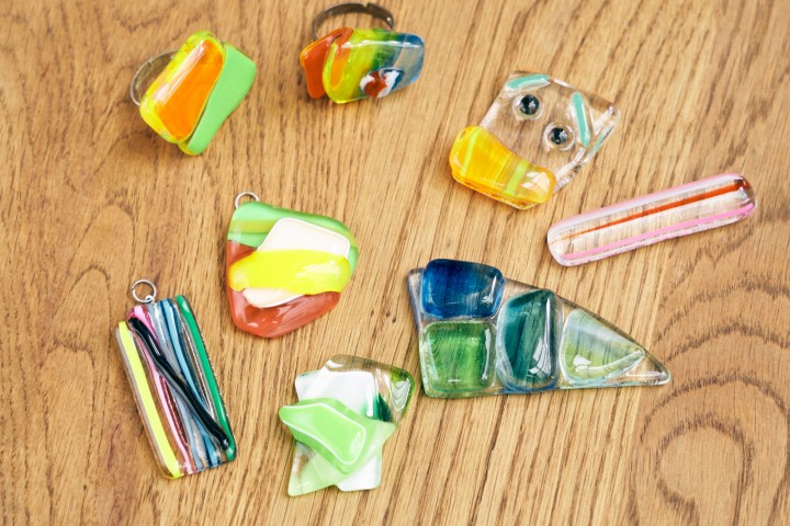 色とりどりの硝子の破片を組み合わせてアクセサリーやおはし置きをつくるワークショップです。
