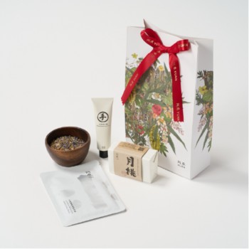 人気アイテムの月桃ハンドクリームとラベンダーの香りが優しいバスソルトに、さらに石けんはお好きな種類をお選びいただけます。心あたたまるギフトパッケージ入り。