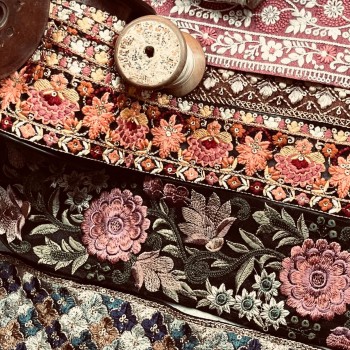 インド刺繍リボンは「サリーボーダー」とも呼ばれ、もともとインドの民族衣装であるサリーの裾を飾るために生まれた装飾品です。細やかな刺繍糸やスパンコール、ビーズなどが組み合わされた繊細で多様なデザインは、手芸材料としても人気があります。