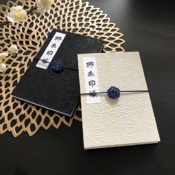 持ち運ぶときにばらけないよう水引の梅型がアクセントのゴムバンドと次のページに挟んでおけるしおり付きです。