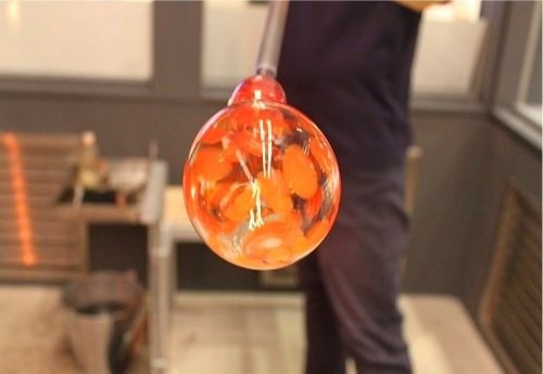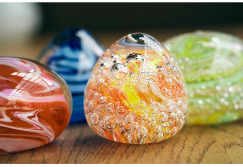 どろどろに溶けた硝子を使ってペーパーウウェイトを作るワークショップです。自由に色を選んで模様をつけることや泡を入れることも出来ます。