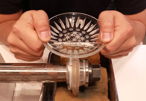 ダイヤモンドが練りこまれた金属のホイールを回転させて硝子を削り、自由に文様を描くワークショップです。難しい印象をお持ちの方が多いですが、こちらも初体験の方でもお楽しみいただけるメニューです。